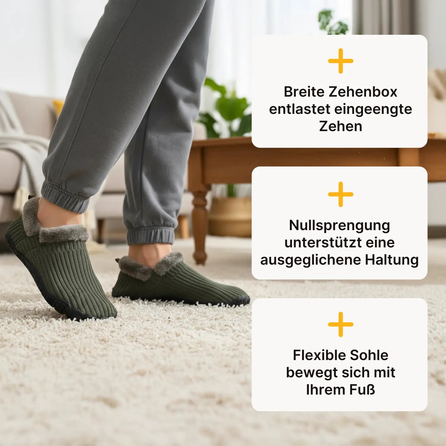 Gebaut wie ein Barfußschuh – nicht wie ein schlapper Hausschuh. Die breite Zehenbox lässt Ihre Zehen entspannen und sich natürlich ausbreiten. Die Nullsprengung fördert eine ausgeglichene Haltung, und die flexible, griffige Gummisohle sorgt für sicheren Halt auf Fliesen, Parkett und bei kurzen Schritten nach draußen zum Müll oder Briefkasten. Wohnlicher Komfort, draußen zuverlässig – für jeden Tag.